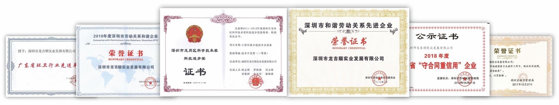 中鑫航憑借專業(yè)的環(huán)衛(wèi)服務(wù),突出的行業(yè)貢獻及規(guī)范的公司治理,歷年來榮獲“中國清潔環(huán)衛(wèi)行業(yè)百強品牌企業(yè)”、中國清潔清洗行業(yè)最高榮譽獎“優(yōu)秀企業(yè)獎”,廣東省守合同重信用企業(yè),廣東環(huán)衛(wèi)二十強企業(yè),深圳市“勞動關(guān)系和諧企業(yè)”,第九屆中國清潔(環(huán)衛(wèi))行業(yè)科技創(chuàng)新獎,廣東省環(huán)衛(wèi)行業(yè)清掃收集運輸企業(yè)二十強等100多項榮譽,其中“生活垃圾大型分選技術(shù)應(yīng)用示范項目”獲得了 2013 年深圳市科技應(yīng)用示范項目,引起了行業(yè)的矚目。