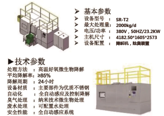 Food waste biodegradation equipment adopts microbial treatment technology, mainly through the combination of physicochemical and biochemical, degrading to produce resource products as soil improvers. The equipment has developed many specifications and models according to the market, which is suitable for small and medium-sized and large-scale food waste processing.
