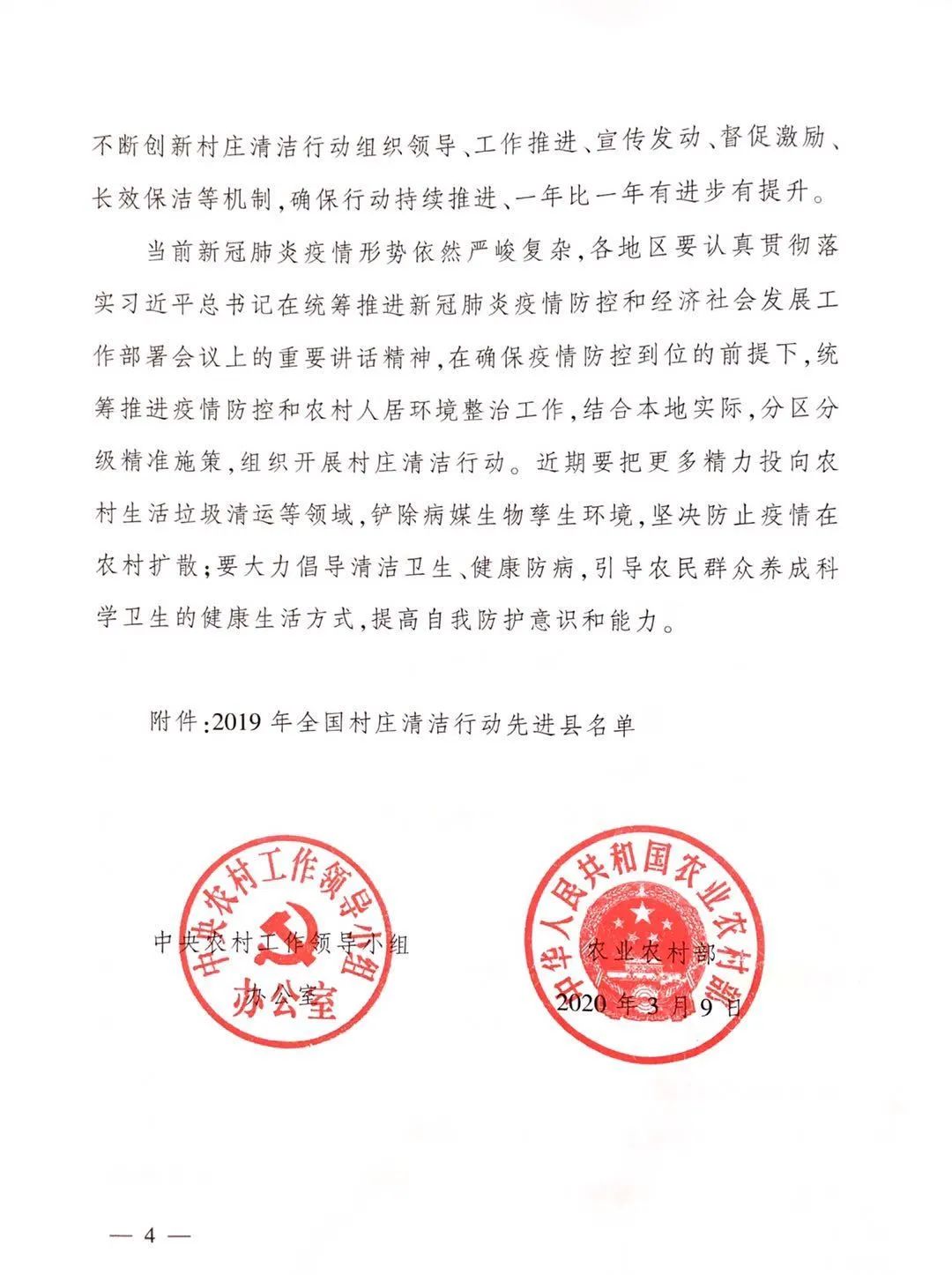 The project of Xiangdong District of Pingxiang City, the project of Sui County of Suizhou City, and the project of Qianxi of Tangshan City under Shenzhen Longjishun Industrial Development Co., Ltd. were successfully selected as "National Advanced County for Village Cleansing Actions", and were reported by the Central Agricultural Office and the Ministry of Agriculture and Rural Affairs.