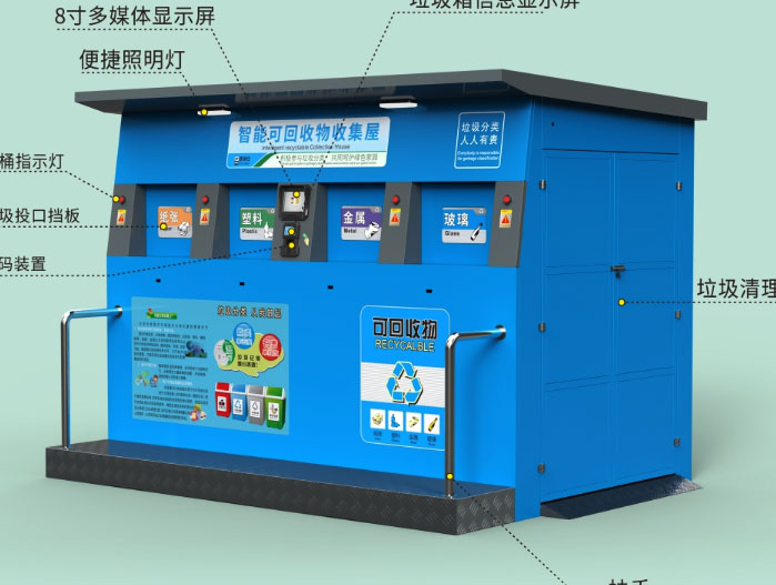 (Internet + Smart Garbage Sorting Pavilion is a collection of smart sorting bins, smart recyclables collection bins, smart garbage bag dispensers, smart point exchange machines, garbage classification data publicity displays, garbage classification publicity broadcasts and posters, etc. All-round intelligent Internet + garbage sorting kiosk)