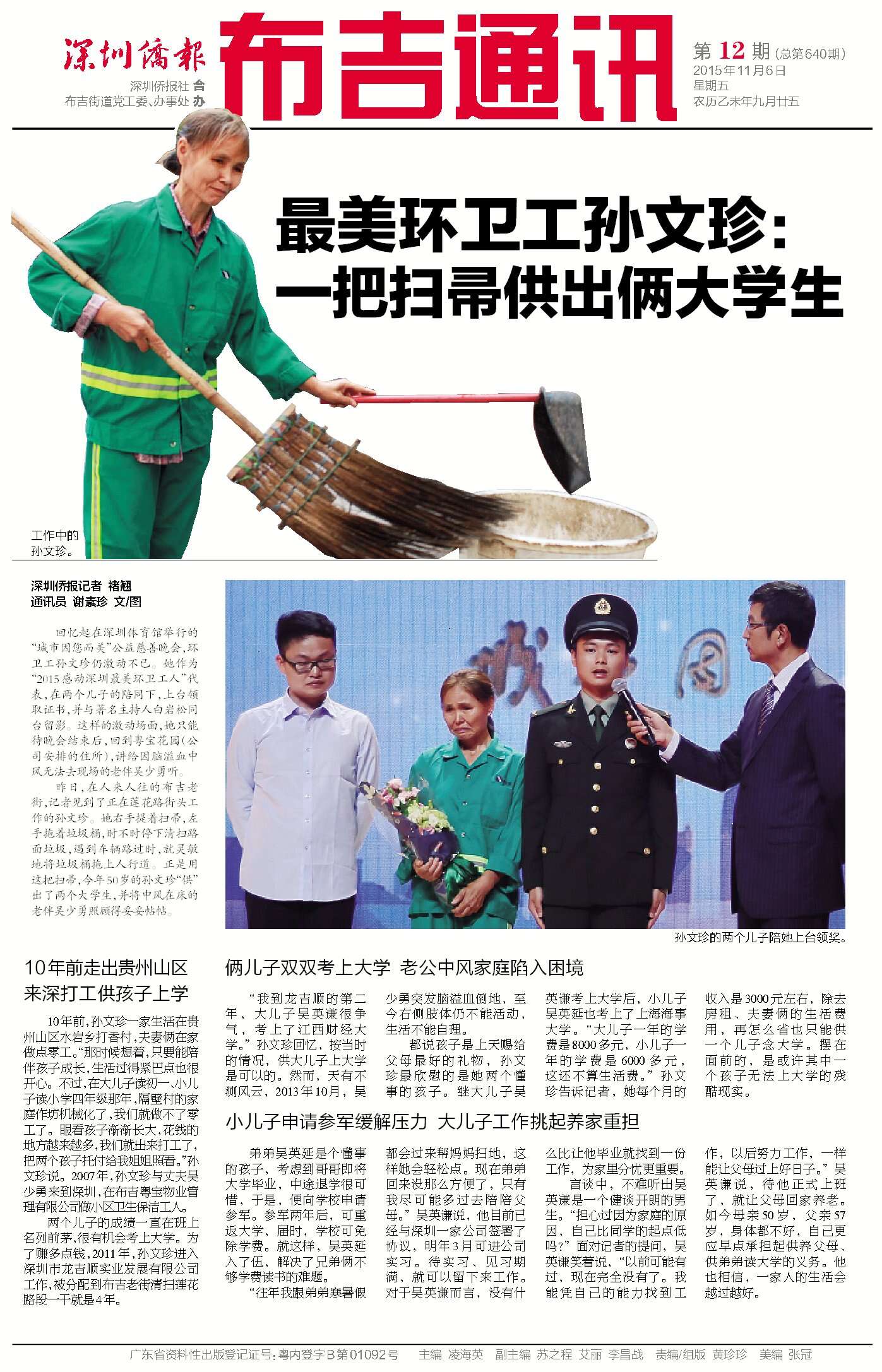 最美環(huán)衛(wèi)工孫文珍:一把掃帚供出兩名大學(xué)生 日期:2015-11-06 上一篇:環(huán)衛(wèi)工子女成長營關(guān)愛盡顯 下一篇:綠色出行,低碳環(huán)保 返回