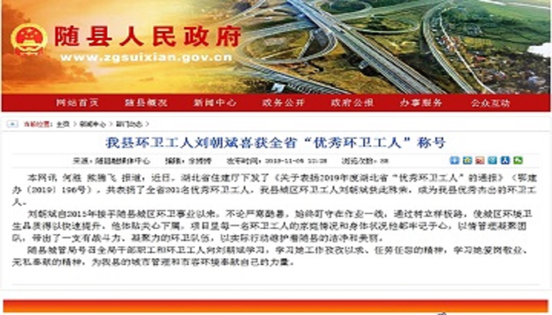 近日,湖北省住建廳下發(fā)了《關于表揚2019年度湖北省“優(yōu)秀環(huán)衛(wèi)工人”的通報》(鄂建辦〔2019〕196號),共表揚了全省201名優(yōu)秀環(huán)衛(wèi)工人,龍吉順隨州分公司環(huán)衛(wèi)工人劉朝斌獲此殊榮,成為隨縣優(yōu)秀杰出的環(huán)衛(wèi)工人。