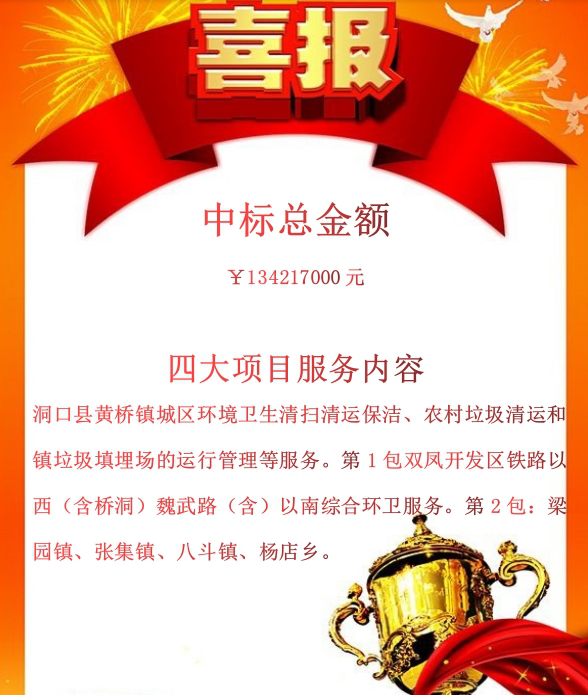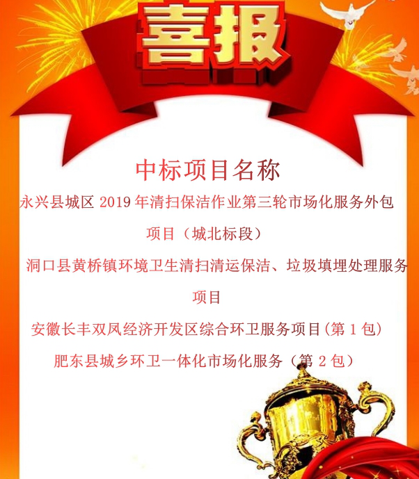 八月份,龍吉順公司迎來“大四喜”。成功中標(biāo)永興縣城區(qū)2019年清掃保潔作業(yè)第三輪市場化服務(wù)外包項目(城北標(biāo)段)、洞口縣黃橋鎮(zhèn)環(huán)境衛(wèi)生清掃清運保潔、垃圾填埋處理服務(wù)項目、安徽長豐雙鳳經(jīng)濟開發(fā)區(qū)綜合環(huán)衛(wèi)服務(wù)項目(第1包)、肥東縣城鄉(xiāng)環(huán)衛(wèi)一體化市場化服務(wù)(第2包)項目,公司又一次實現(xiàn)了質(zhì)的飛躍。