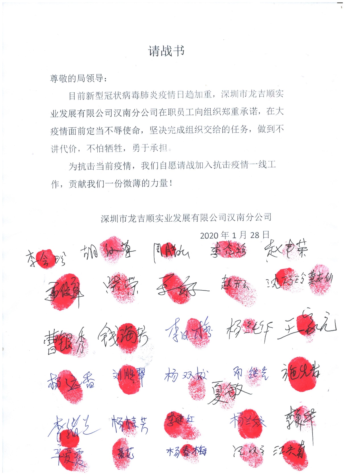 “我們自愿請戰(zhàn)加入抗擊疫情一線保潔工作,貢獻(xiàn)我們一份微薄的力量!”1月28日,面對疫情,45名環(huán)衛(wèi)工人集體寫下《請戰(zhàn)書》,隨時進(jìn)駐醫(yī)院參與清掃保潔工作,其中有32名環(huán)衛(wèi)工人來自深圳市龍吉順實業(yè)發(fā)展有限公司漢南分公司。