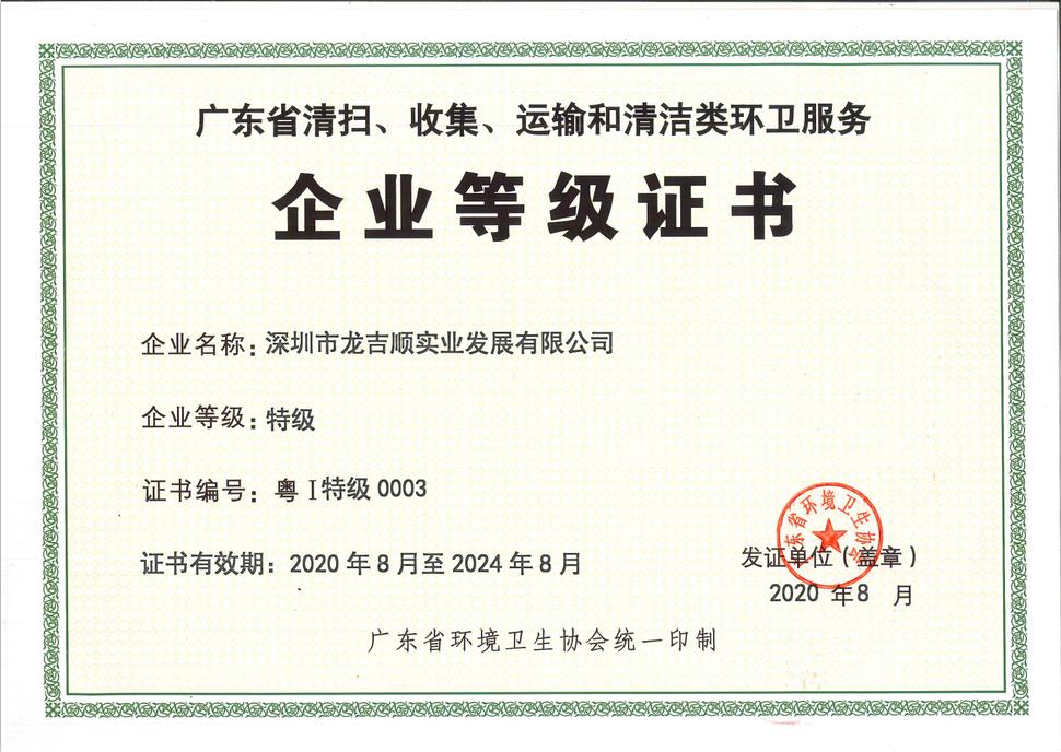 根據(jù)粵環(huán)協(xié)[2020]13號文件“關(guān)于2020年第一批《廣東省環(huán)衛(wèi)服務(wù)企業(yè)等級》評定企業(yè)名單的公告”,深圳市龍吉順實(shí)業(yè)發(fā)展有限公司評定等級為特級。