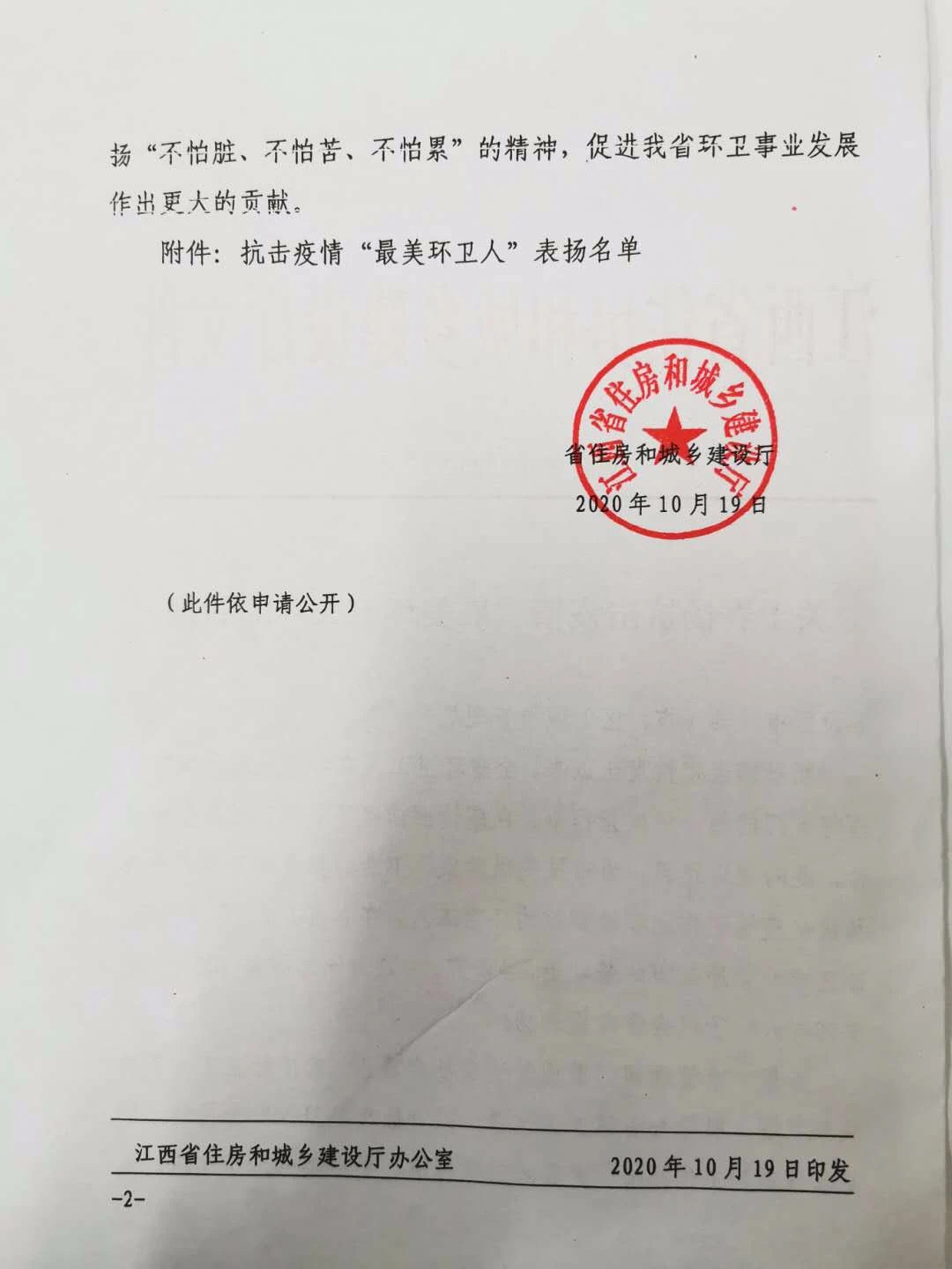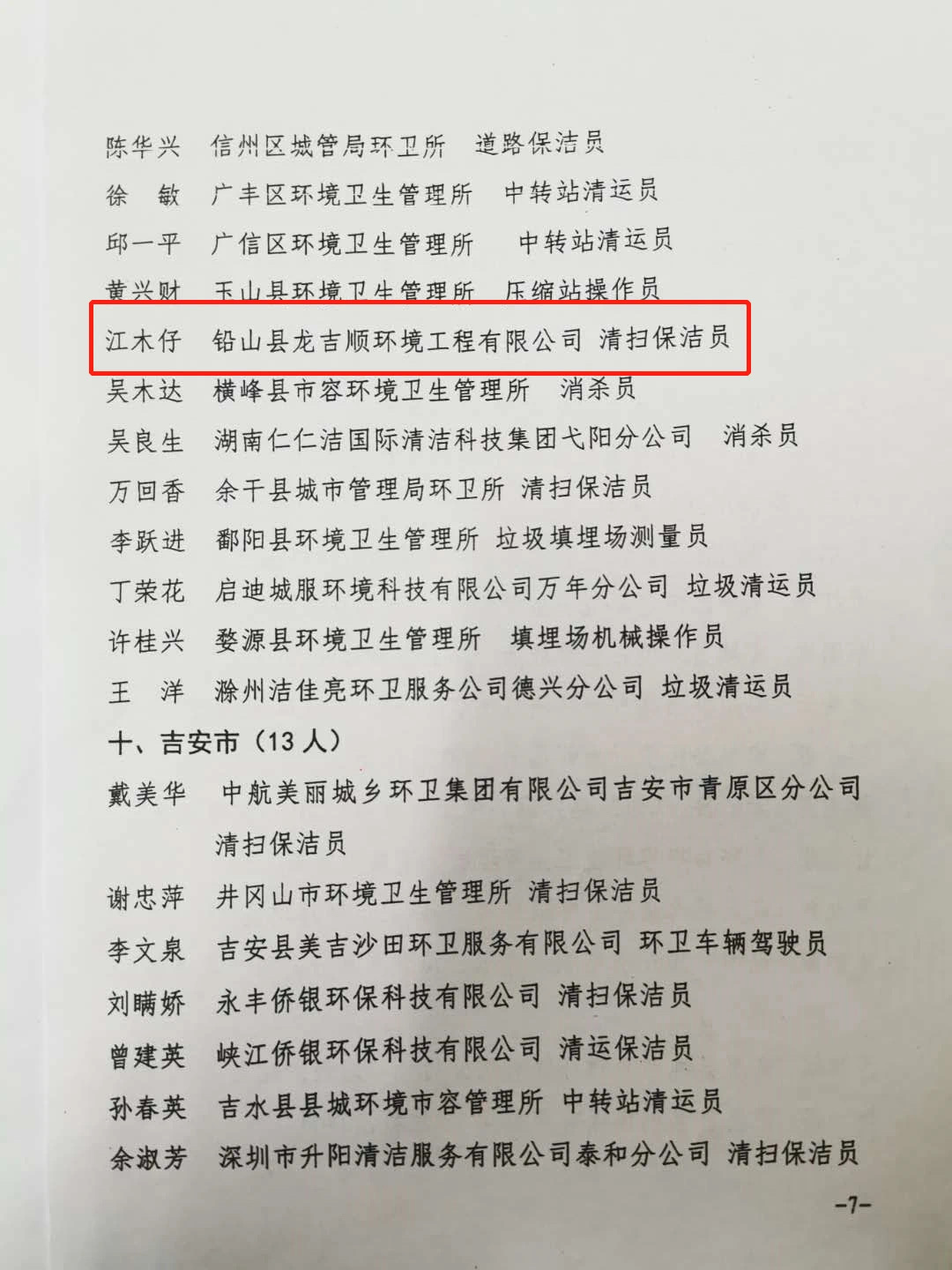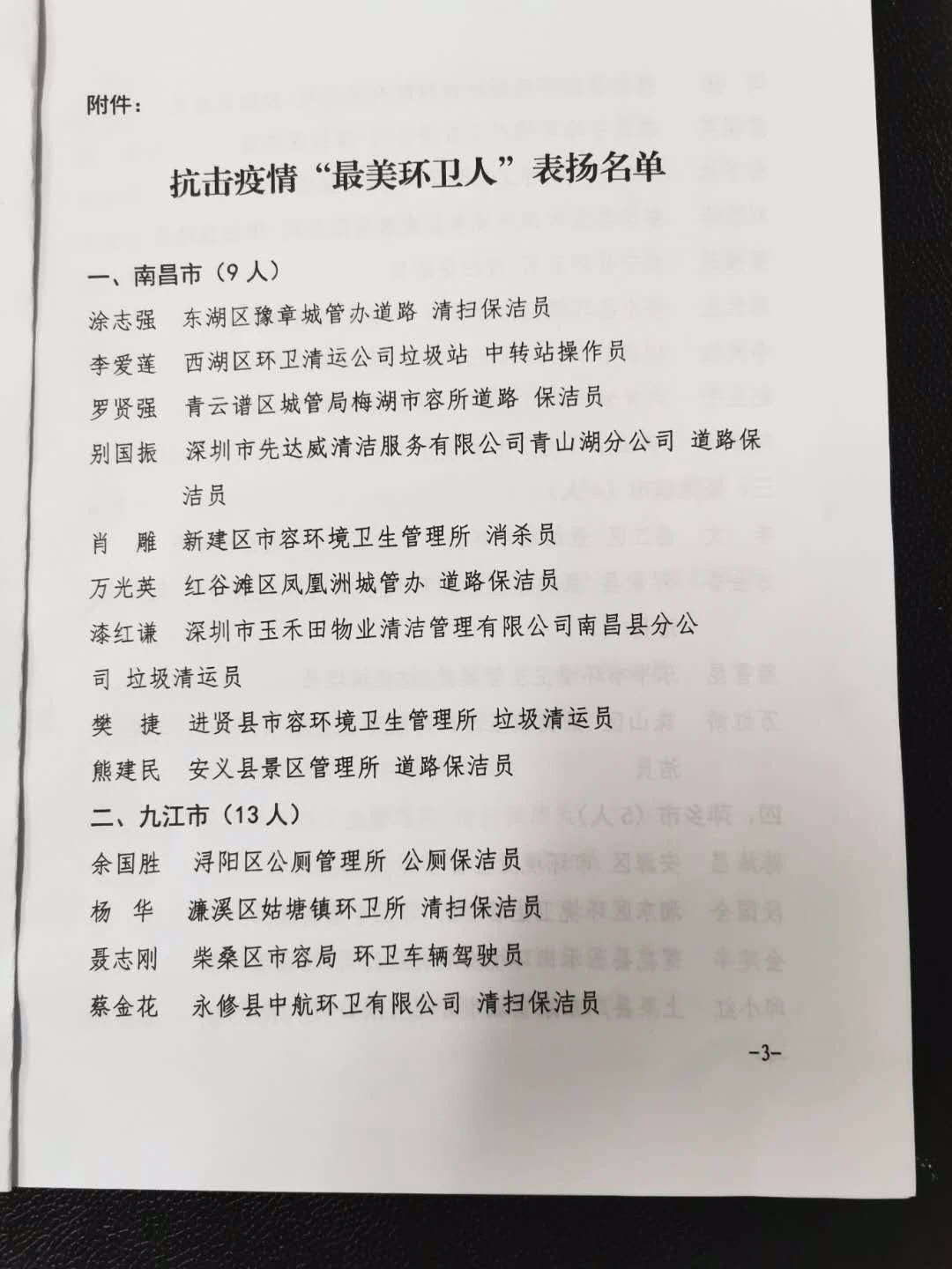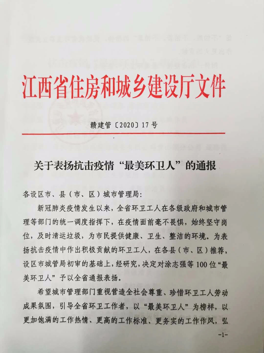根據(jù)江西省住房和城鄉(xiāng)建設(shè)廳文件贛建管【2020】17號“關(guān)于表揚抗擊疫情“最美環(huán)衛(wèi)人”的通報”,湖口龍吉順環(huán)衛(wèi)有限公司清掃保潔員柳華妹和鉛山縣龍吉順環(huán)境工程有限公司清掃保潔員江木仔獲此殊榮。疫情就是命令,防控就是責任,在這場與時間賽跑,與病毒較量的戰(zhàn)斗中,柳華妹和江木仔充分展示了“最美環(huán)衛(wèi)人”的崇高風尚。
